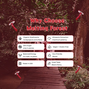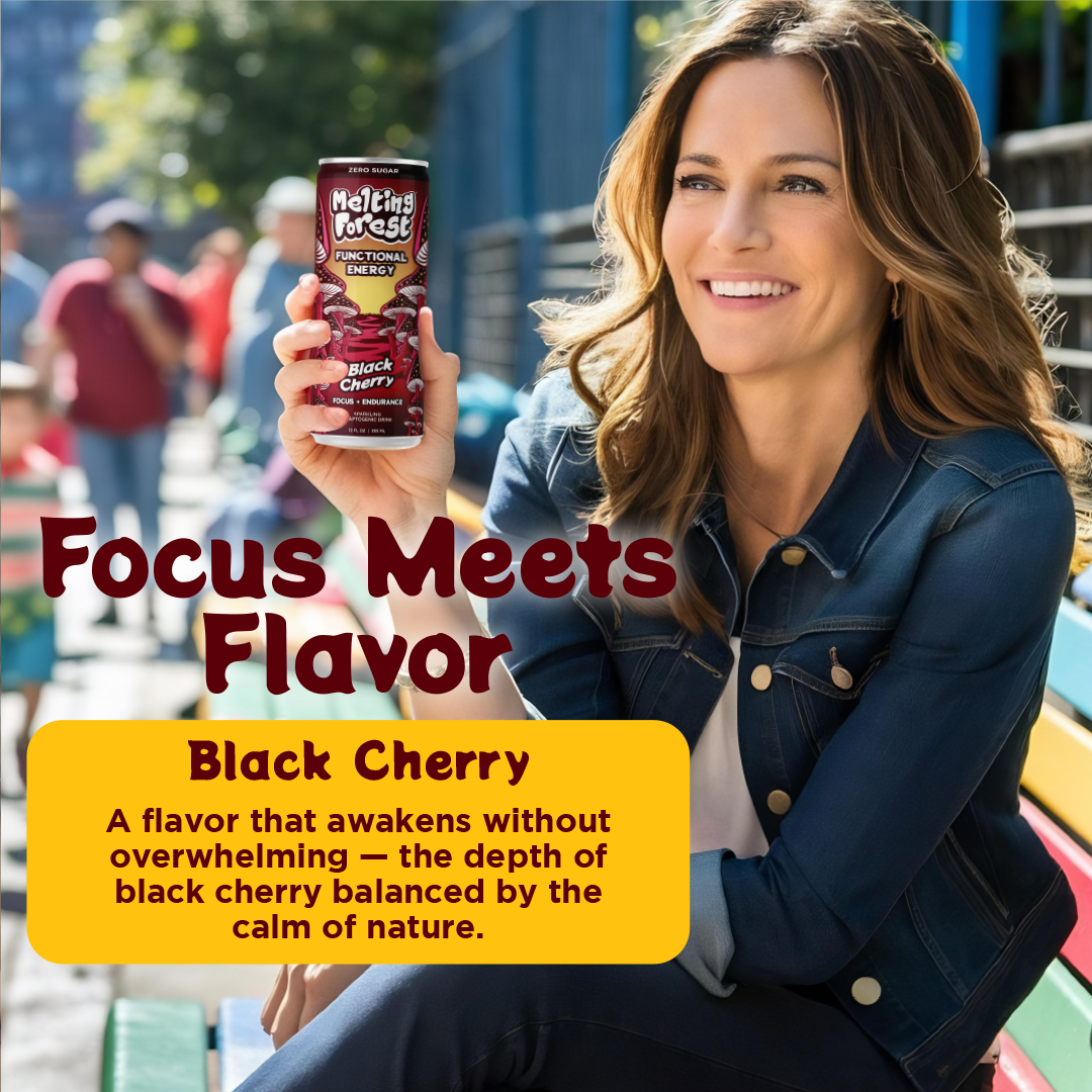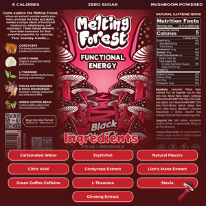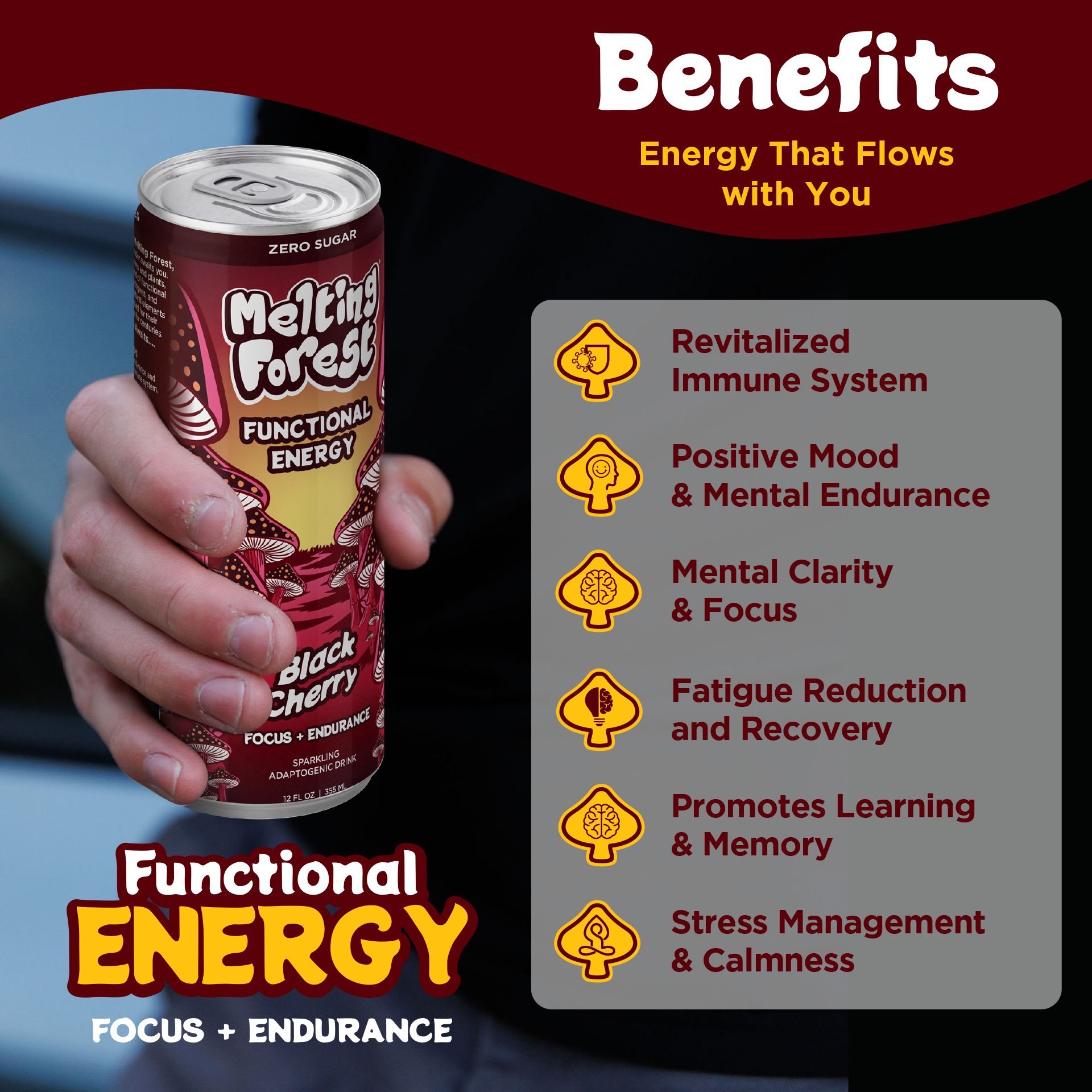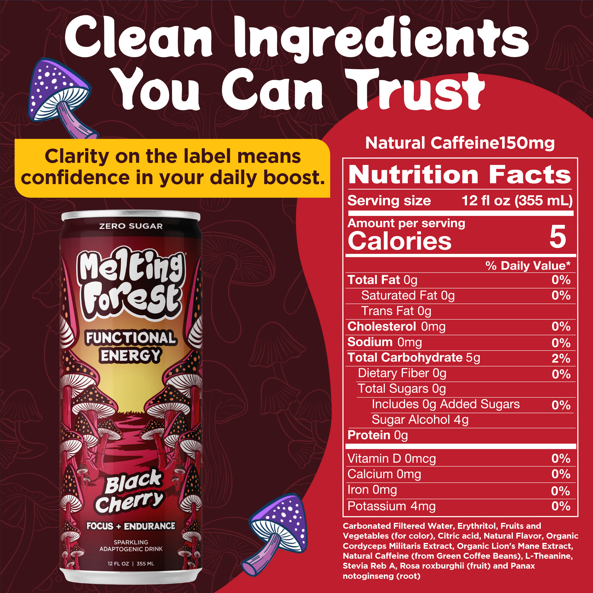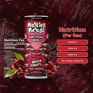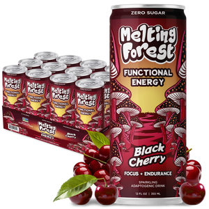 12 packs | Adaptogens & Nootropics Sparkling DrinksMelting Forest Black Cherry Energy Drink is a dynamic, stimulating beverage that boosts energy and focus. Infused with the rich and deep flavors of black cherry, this drink offers a deliciously robust taste experience. It's powered by 150mg of natural caffeine derived from green coffee beans, providing a sustained energy lift without the jitters. The addition of Cordyceps and Lion's Mane mushrooms enhances mental clarity and physical performance. Further enriched with the antioxidant properties of Rosa Roxburghii and the revitalizing effects of Panax Notoginseng (Ginseng), this energy drink is not just a burst of energy but a nourishing choice for your body and mind. Perfect for those needing an extra push to conquer their day.
