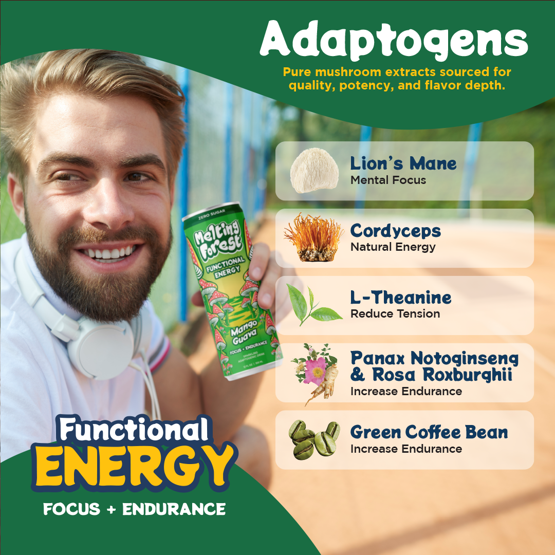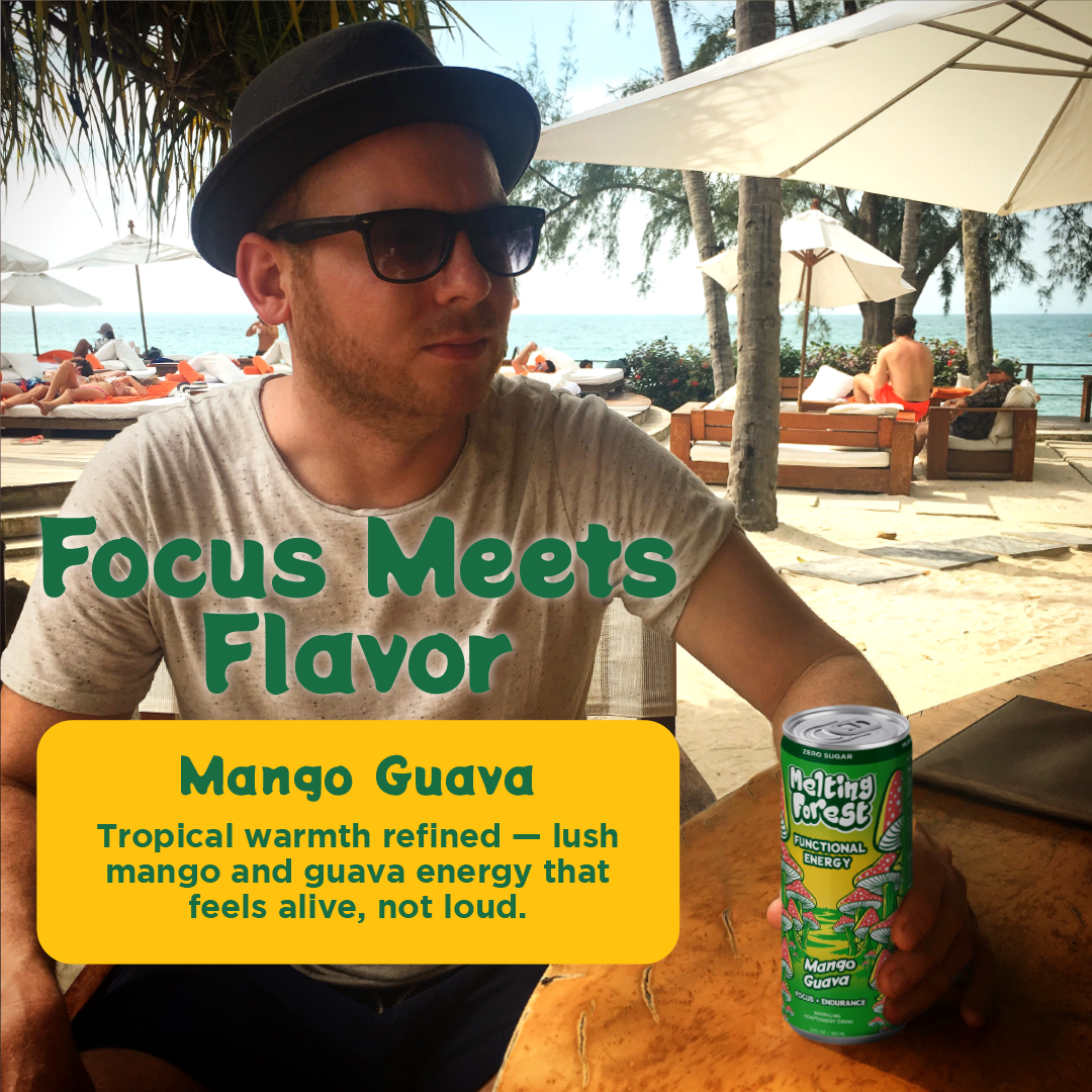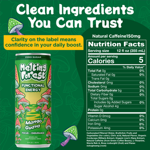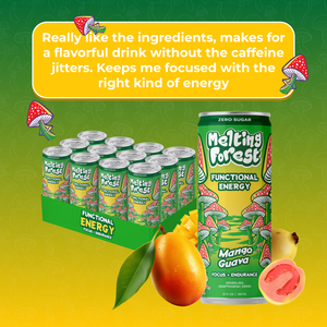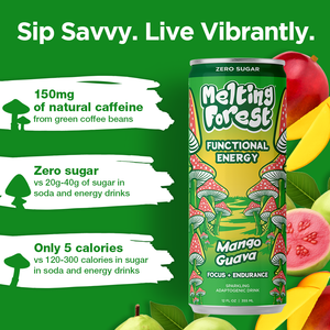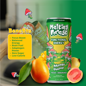 12 packs | Adaptogens & Nootropics Sparkling DrinksMelting Forest Mango Guava Energy Drink is a vibrant and energizing beverage designed to elevate your day. This delightful drink combines the exotic and sweet flavors of ripe mangoes with the luscious taste of guava, creating a tropical taste sensation. It's charged with 150mg of natural caffeine from green coffee beans, ensuring a smooth and steady energy boost. The formulation includes the brain-boosting power of Cordyceps and Lion's Mane mushrooms, enhancing focus and cognitive function. The drink also features the antioxidant benefits of Rosa Roxburghii and the revitalizing properties of Panax Notoginseng (Ginseng), making it a wholesome choice for sustained energy and wellness. It is ideal for those seeking a delicious, natural way to stay energized and alert.