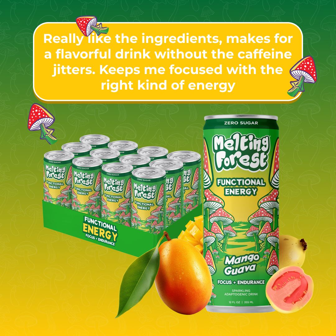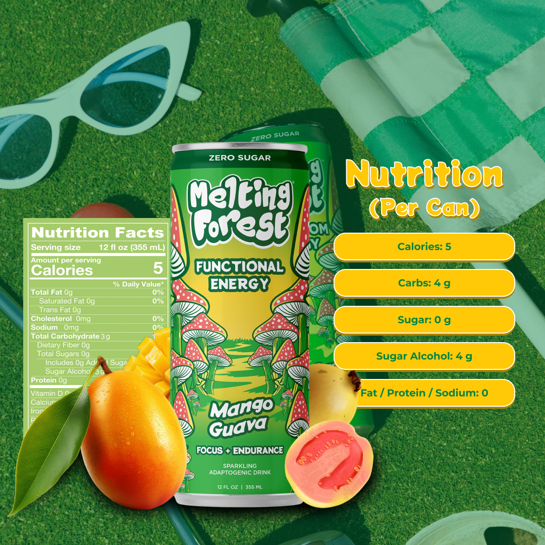 12 packs | Adaptogens & Nootropics Sparkling DrinksMelting Forest Mango Guava Energy Drink is a vibrant and energizing beverage designed to elevate your day. This delightful drink combines the exotic and sweet flavors of ripe mangoes with the...