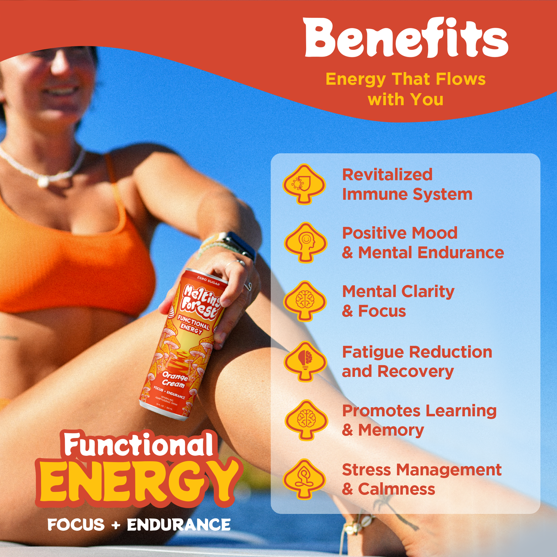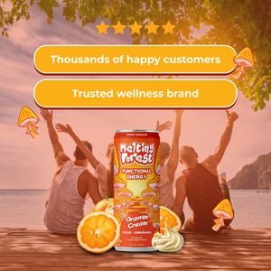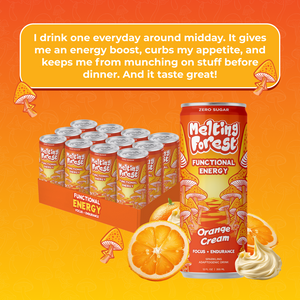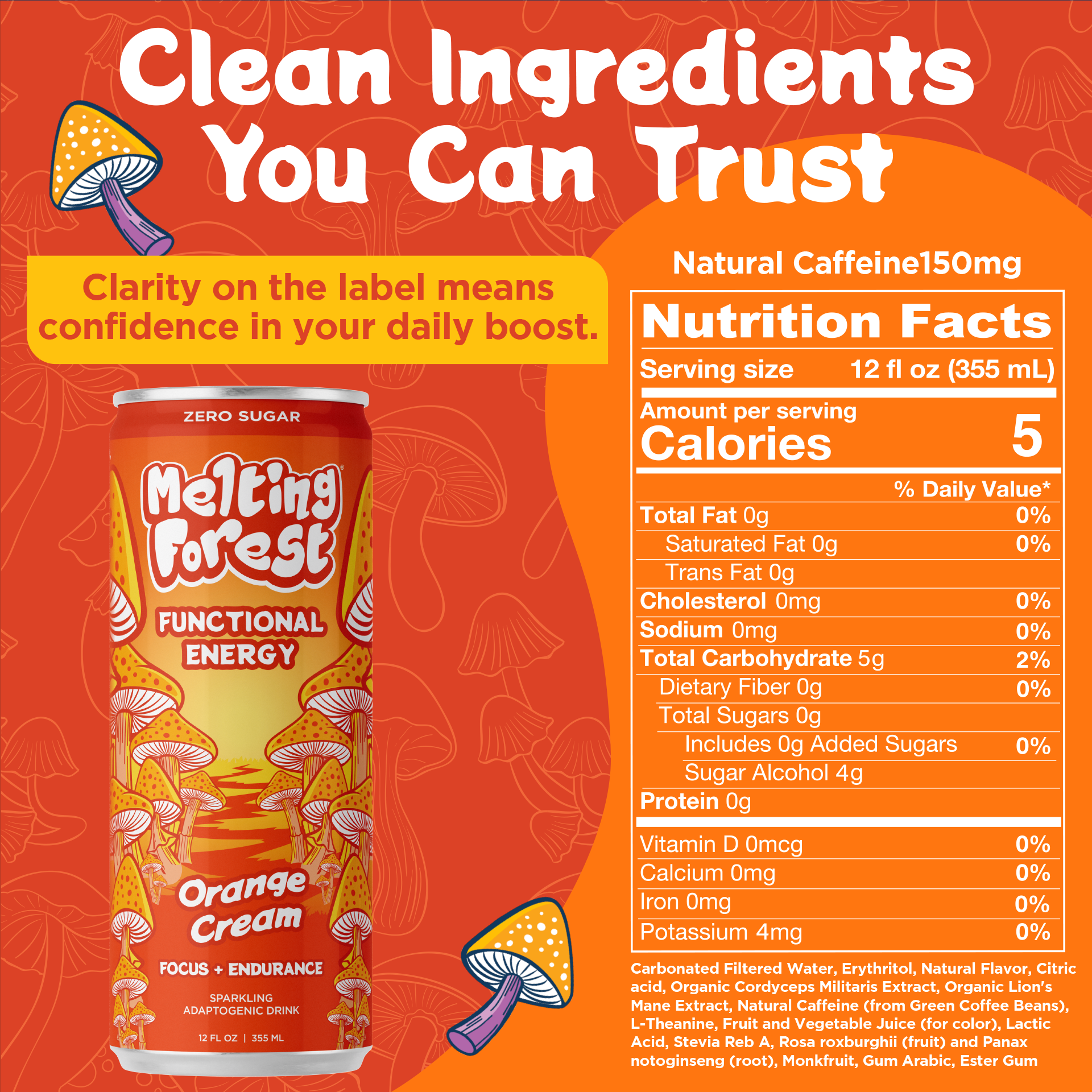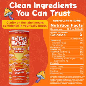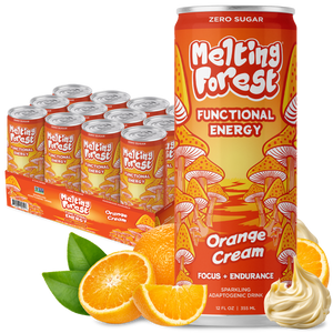12 packs | Adaptogens & Nootropics Sparkling DrinksMelting Forest Orange Cream Energy Drink is a delightful, energizing beverage that combines the nostalgic flavors of creamy orange with a modern, health-conscious twist. This drink offers the luscious, citrusy sweetness of oranges blended with a smooth, creamy undernote reminiscent of a classic orange creamsicle. It's infused with 150mg of natural caffeine from green coffee beans, providing a steady and balanced energy boost. Enhanced with the cognitive benefits of Cordyceps and Lion's Mane mushrooms, it improves focus and mental agility. The drink also incorporates the antioxidant power of Rosa Roxburghii and the vitality-enhancing properties of Panax Notoginseng (Ginseng), making it not just an energizing choice but a nurturing one for both mind and body. Perfect for those seeking a refreshing and uplifting energy source.