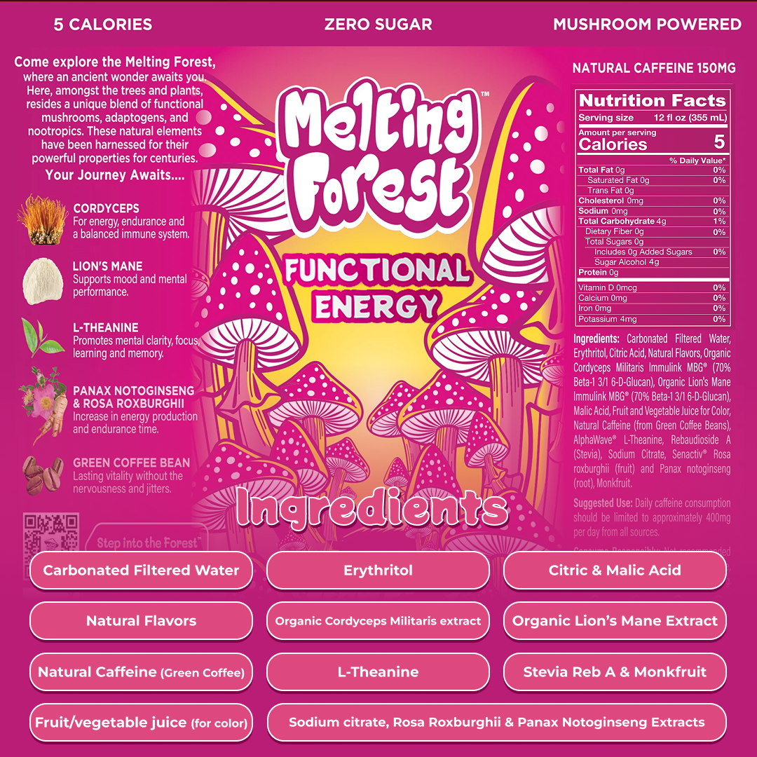12 packs | Adaptogens & Nootropics Sparkling DrinksMelting Forest Strawberry Lemonade Energy Drink" is a refreshingly vibrant beverage designed to invigorate and energize. It masterfully blends lemonade's classic, tangy zest with the sweet, summery essence of ripe strawberries, offering a delightful and tantalizing flavor. Powered by 150mg of natural caffeine from green coffee beans, this drink provides a smooth, sustained energy lift. Enhanced with the cognitive-supporting benefits of Cordyceps and Lion's Mane mushrooms, it sharpens focus and mental clarity. Additionally, it features the antioxidant richness of Rosa Roxburghii and the energy-boosting qualities of Panax Notoginseng (Ginseng), making it a nourishing and revitalizing choice for those needing an energy surge with a delicious twist.
